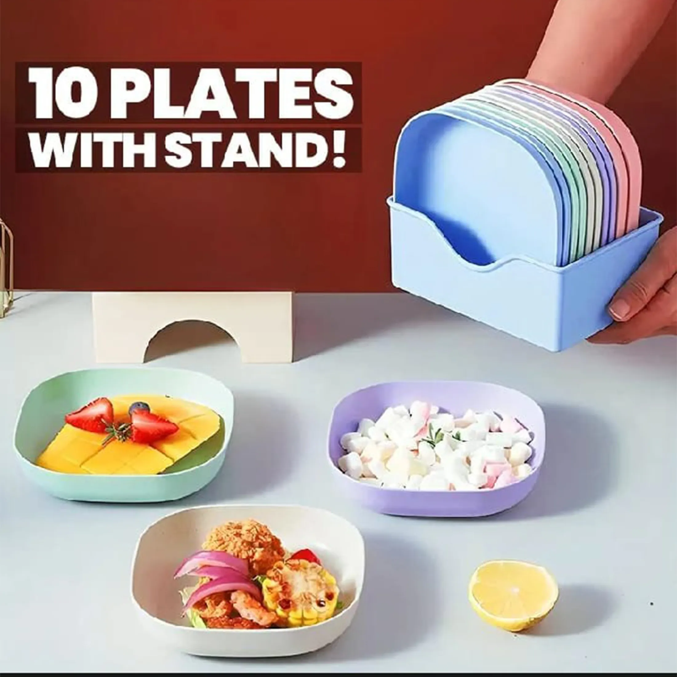 ✅ Set of 10 reusable plates with stand, perfect for family use